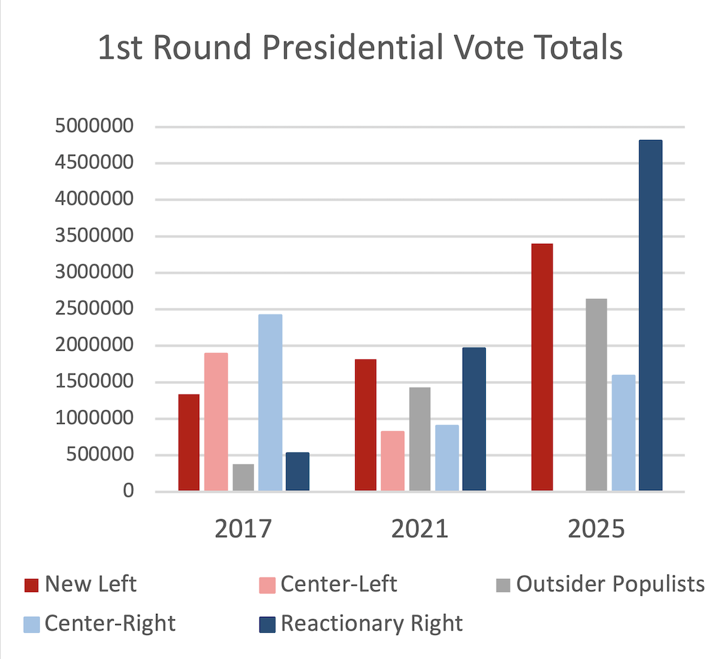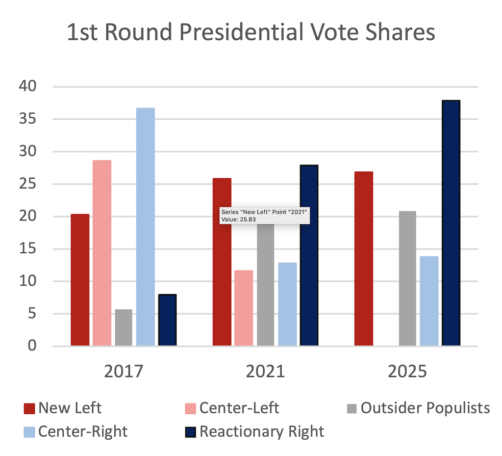 La nueva izquierda amplió su apoyo en 2021, pero la creciente frustración con la hiperprogresista asamblea constituyente en medio de la pandemia y la recesión económica impulsó a Kast al primer lugar. En esta ocasión, la extrema derecha, personificada en Kast y su antiguo correligionario Kaiser, fue la ganadora indiscutible. Mientras que la amplia izquierda centrista solo aumentó marginalmente su porcentaje, los votos para la extrema derecha crecieron de poco más de una cuarta parte a más de un tercio del electorado.