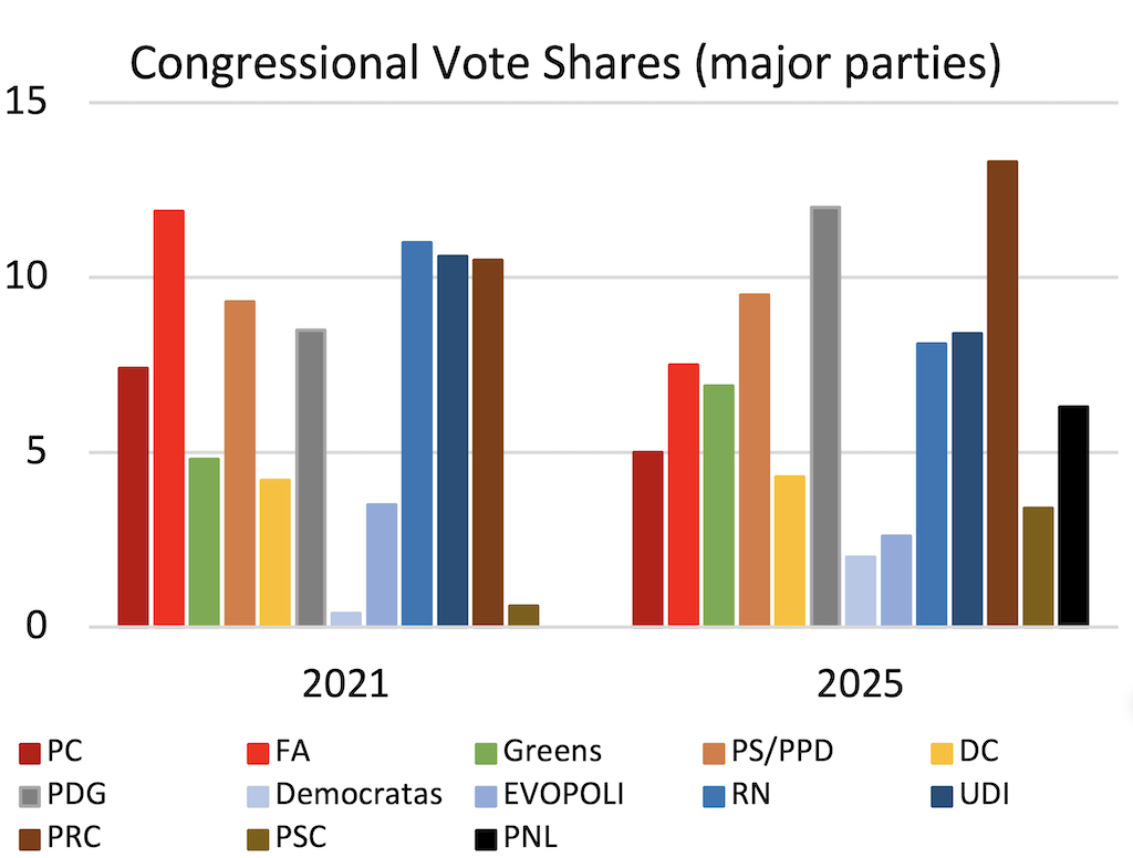 Es significativo que la desaparición definitiva de la alianza de centroderecha, que ha durado treinta y cinco años, sea prácticamente segura. Por el contrario, el PR de Kast creció de forma espectacular, con diecisiete escaños más. Cuatro años después de sus primeras elecciones, ahora controla la agenda legislativa. El único otro partido que ha experimentado un crecimiento tan rápido es el PDG de Parisi, que ha sumado trece escaños, convirtiéndose en el segundo partido más grande del Congreso.
