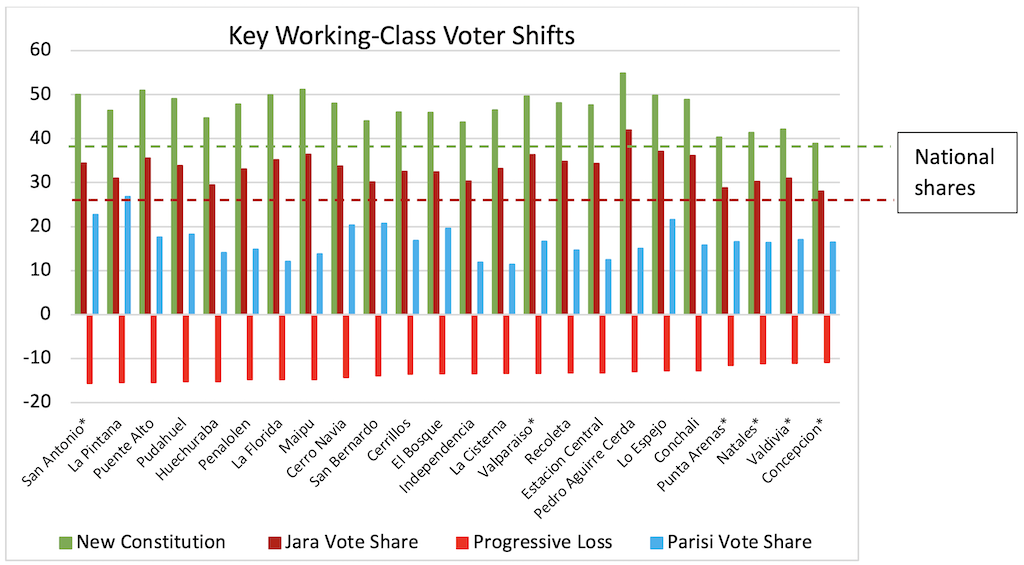 Las pruebas preliminares sugieren que sectores críticos de los partidarios de Parisi, tras haber respaldado la constitución propuesta en 2022, simplemente abandonaron a la izquierda. El PDG logró importantes avances precisamente en distritos donde la izquierda superó sus promedios nacionales de votos, pero donde Jara perdió votos sustanciales en relación con el apoyo progresista a la nueva carta magna. Tras llegar a la conclusión de que la reforma progresista había fracasado, cientos de miles de personas parecen haber migrado al bando de Parisi, convencidas por sus ofertas pragmáticas de una meritocracia que nivela el campo de juego.